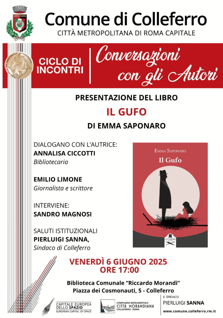 Protagonista di questo appuntamento sarà Emma Saponaro, con il suo nuovo romanzo, “Il Gufo” (Les Flâneurs Edizioni, pp. 238, euro 17), illustrato in copertina da Alessandro Arrigo e introdotto dalla prefazione della scrittrice Patrizia Rinaldi. L’evento, a ingresso libero, vedrà la partecipazione di Sandro Magnosi, esperto di storia locale, in veste di presentatore, mentre a dialogare con l’autrice saranno Annalisa Ciccotti, bibliotecaria e responsabile del Centro di Documentazione di Colleferro, e Emilio Limone, giornalista, scrittore e maresciallo dei Carabinieri.